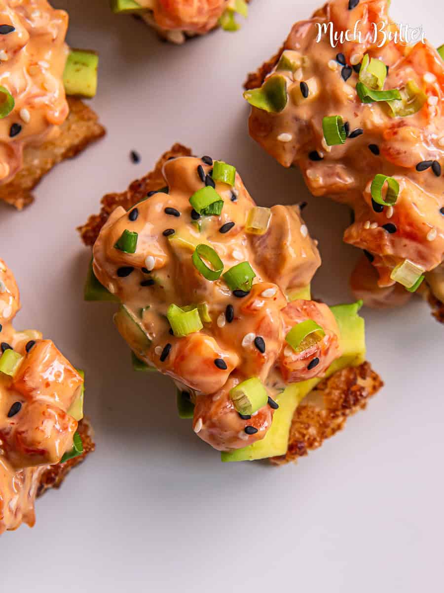 You’ve seen it on your “For You” page, now make it at home! This is our take on the viral Nobu-style appetizer . We fry seasoned sushi rice until it’s golden and crispy, then top it with a creamy, spicy salmon mix (salmon, mayo, sriracha) and a slice of jalapeño . The texture contrast between the crunchy rice and creamy topping is addictive—your guests won’t be able to stop at just one !