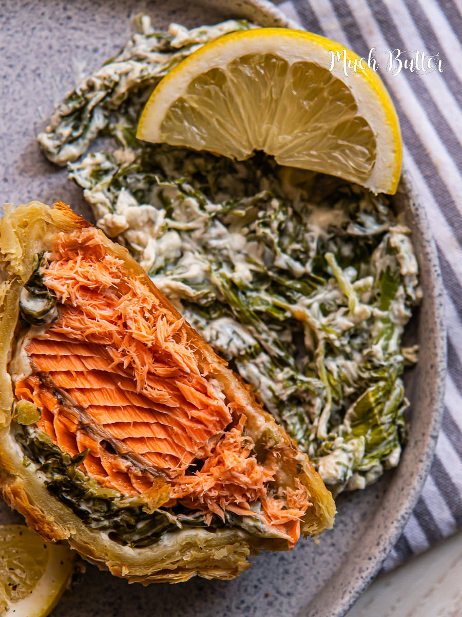For the centerpiece, we have “Pure Elegance” wrapped in pastry . Salmon En Croute looks incredibly professional but is surprisingly simple to assemble. The buttery puff pastry locks in the moisture of the salmon, creating a tender, flaky bite every time . It slices beautifully for a buffet table and adds that “wow” factor to your spread.
