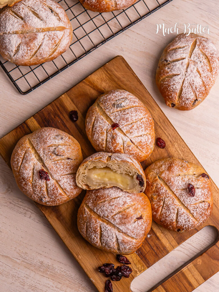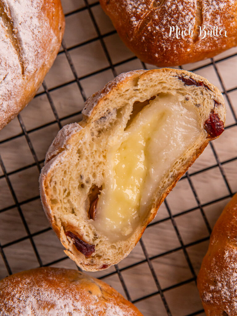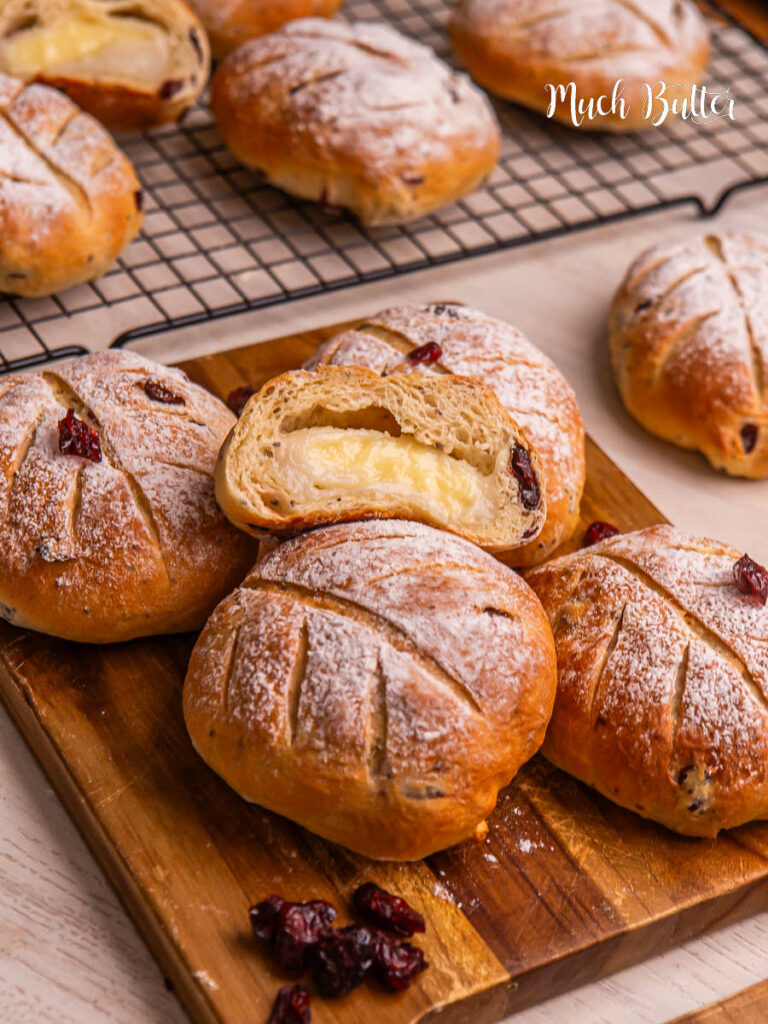 Hidden inside each roll is a chewy mochi center that stretches beautifully when you pull the bread apart. The contrast between the airy bread and the gooey mochi creates that addictive bite — soft, chewy, and a little bouncy — making it unlike any bread you’ve ever tried. - Cream Cheese & Cranberries