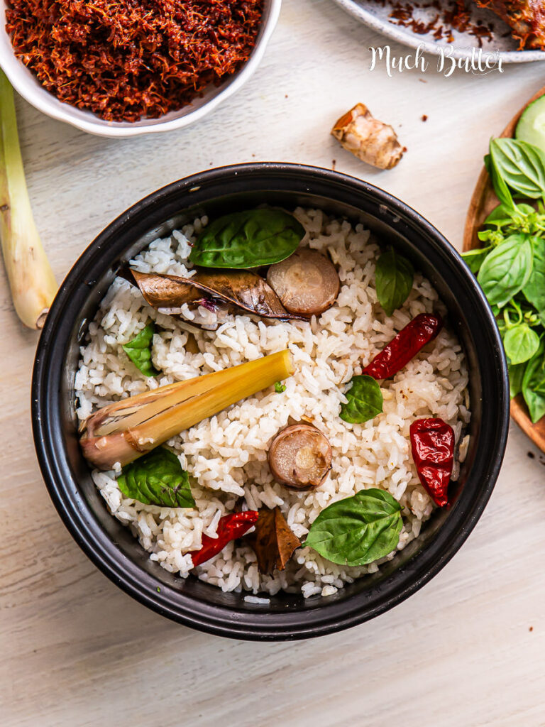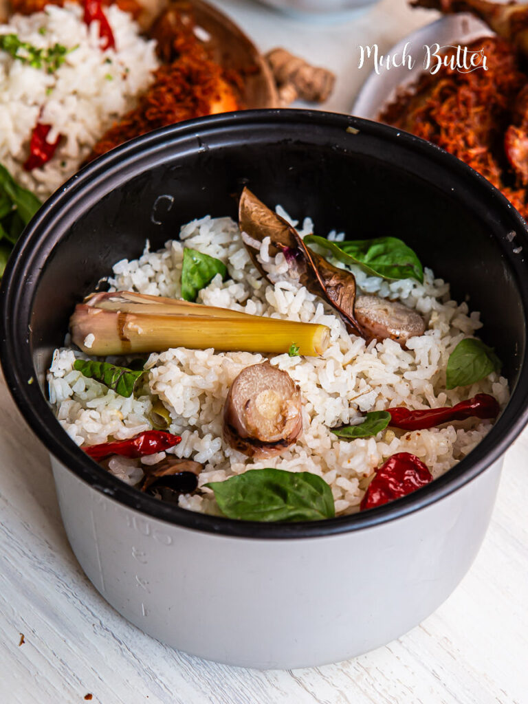 After that, transfer the rinsed rice into the inner pot of your rice cooker. Add the sautéed aromatics, galangal, lemongrass, bird’s eye chilies, bay leaves, salt, chicken stock powder, pepper, and water. Stir gently to combine everything well.
